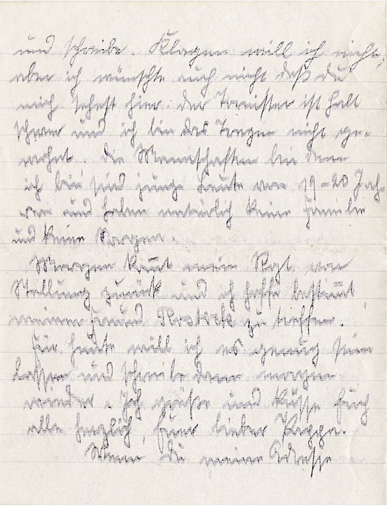 Wie ich höre, bleib ich noch längere Zeit hinter der Front und soll das Regiment vermutlich dorthin kommen wo Karl zuletzt war. Genaueres kann ich nicht sagen und auch noch keine Adresse angeben, weil ich noch nicht der Kompanie zugeteilt bin.