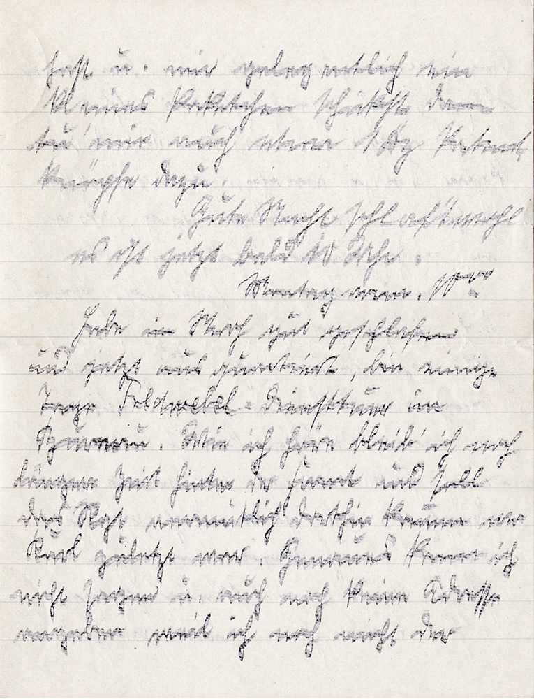 Wie ich höre, bleib ich noch längere Zeit hinter der Front und soll das Regiment vermutlich dorthin kommen wo Karl zuletzt war. Genaueres kann ich nicht sagen und auch noch keine Adresse angeben, weil ich noch nicht der Kompanie zugeteilt bin.